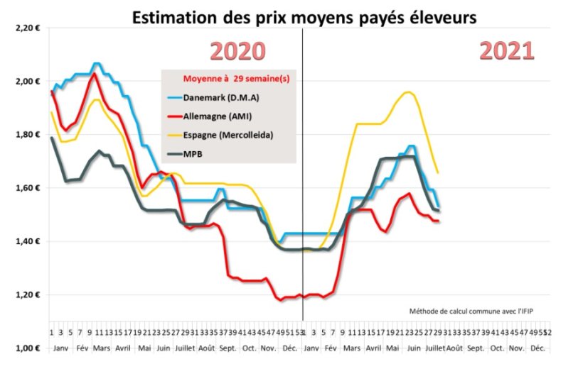 Au 14 juillet, le prix moyen en Chine est à 15,92 CNY pour un équivalent de 2,09 euro le kilo vif, 56% sous la même référence 2020 et légèrement sous la référence 2019.