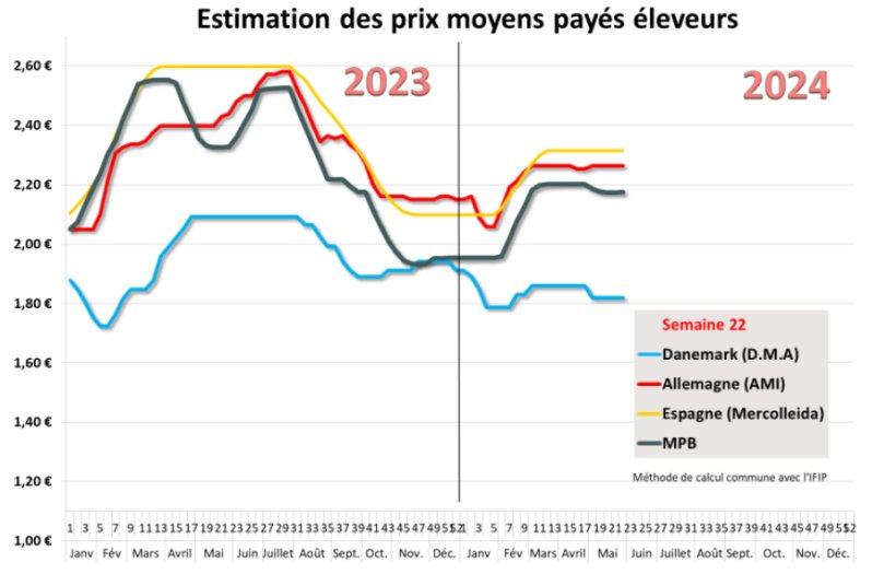 En Chine, au 29 mai, le prix du porc moyen s’affiche à 17,46 CNY (2,23 euros) et rejoint le niveau le plus élevé depuis un an, le 3 août 2023 à 17,61 CNY. Une tendance nettement positive s’affirme donc actuellement. Selon les commentaires chinois, les éleveurs retiennent un peu plus leurs porcs, l’approvisionnement des abattoirs est plus difficile même si la consommation reste encore assez faible pour le moment. Les cours sont attendus en hausse à court terme.