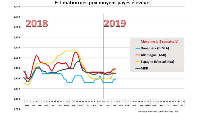 En poursuivant ses hausses successives, la référence espagnole prend, à présent, la tête des principales cotations européennes, dépassant de peu le cours allemand. La situation peut paraître paradoxale, puisque au dernier recensement du cheptel européen de décembre 2018, de tous les grands bassins de production de l’UE, l’Espagne est pratiquement le seul pays (avec la France), dont le cheptel est en croissance alors que les pays tels que l’Allemagne, les Pays-Bas, le Danemark, la Pologne voient leur cheptel total et cheptel reproducteur baisser. Pourtant, alors que la croissance de la production se poursuit, seule la référence espagnole progresse de 10 cents en équivalent du kilo carcasse et ceci depuis 1 mois. Il faut cependant signaler que l’augmentation de la production sera moins importante qu’attendue en raison d’une plus grande mortalité des porcelets à la suite d’une utilisation réduite de certains antibiotiques. Ceci intervient dans un contexte d’augmentation des capacités d’abattage qui met évidemment la pression sur l’approvisionnement en porcs charcutiers. La demande de cette fin février semble s’améliorer avec notamment des achats chinois en hausse sur certains produits comme le jambon et des sous-produits. Sur le marché intérieur, quelques améliorations sont également perceptibles. En Italie, la baisse du cours est une nouvelle fois d’actualité malgré un relatif équilibre offre / demande, mais les abattoirs mettent la pression sur le prix en profitant de la hausse des poids.