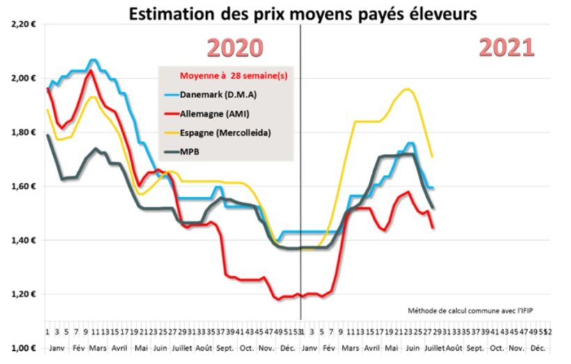 Au Danemark, le prix d’acompte danois, après avoir été stabilisé la semaine dernière, recule de 6 centimes pour cette nouvelle semaine. La baisse totale depuis la mi‐juin est de 22 centimes d’euro ! Tous les grands pays exportateurs qui avaient connu un commerce très lucratif avec la Chine durant de nombreux mois, portant les prix du porc très haut, se retrouvent aujourd’hui à ajuster drastiquement leur cours au niveau du marché européen.