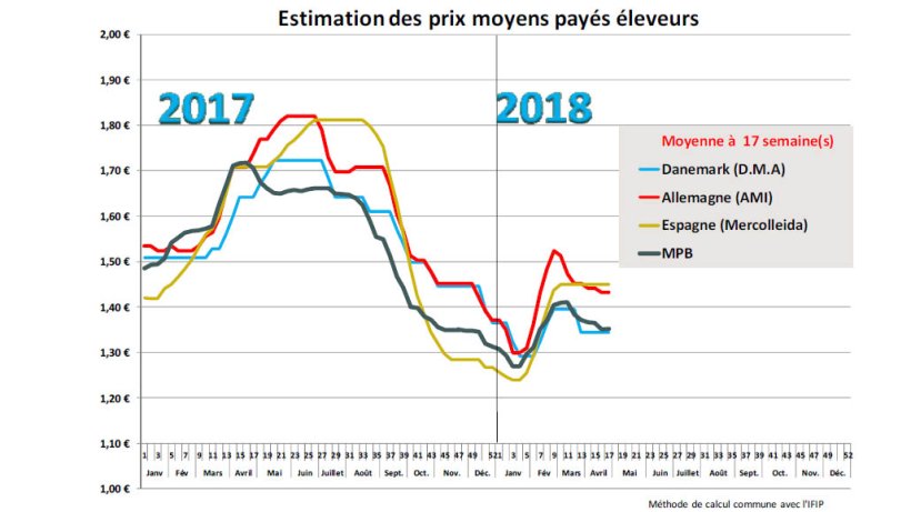 Les 2 séances de ventes hebdomadaires se sont caractérisées par des comportements à l’achat diamétralement opposés selon les outils et leur demande respective. Cela a abouti à la reconduction du cours qui s’établit ainsi à 1,181 euro (+ 0,1 cent dans la semaine) soit 36 centimes en‐dessous de la référence du 27 avril 2017. Sur les 17 premières semaines 2018, la moyenne cumulée est de 1,175 euro contre 1,420 euro en 2017 (‐17,25%). A la veille de la semaine fériée du 1er mai, l’activité est assez forte puisque 389 118 porcs ont été abattus, ceci pour compenser la perte d’une journée d’activité de cette nouvelle semaine. L’intensité des abattages a eu pour résultat une baisse significative des poids de 290 g qui s’établissent à 95,16 kg. Depuis le début de l’année, les poids moyens d’abattage sont 800 g plus élevés que l’an passé et l’offre de porcs en tête, à nombre de jours égal, est supérieure de 2,45 % environ. Comme dans le reste de l’Europe, la hausse de production pèse sur la revalorisation du prix du porc avec une consommation intérieure peu dynamique et un commerce à l’export (qui compte pour près de 30 % de la production nationale) confronté aux mêmes difficultés que les autres exportateurs européens à savoir une forte concurrence sur des marchés très disputés et un resserrement des achats chinois.