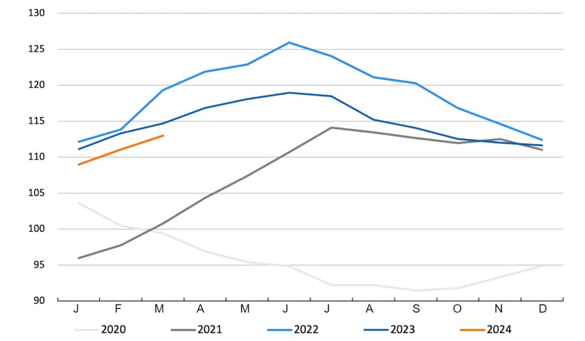 Les prix de la viande de porc ont également augmenté, principalement en raison de la hausse de la demande intérieure à l'approche des vacances de Pâques, malgré une offre accrue, en particulier en Europe de l'ouest. Indice FAO des prix de la viande de porc. Source : FAO.