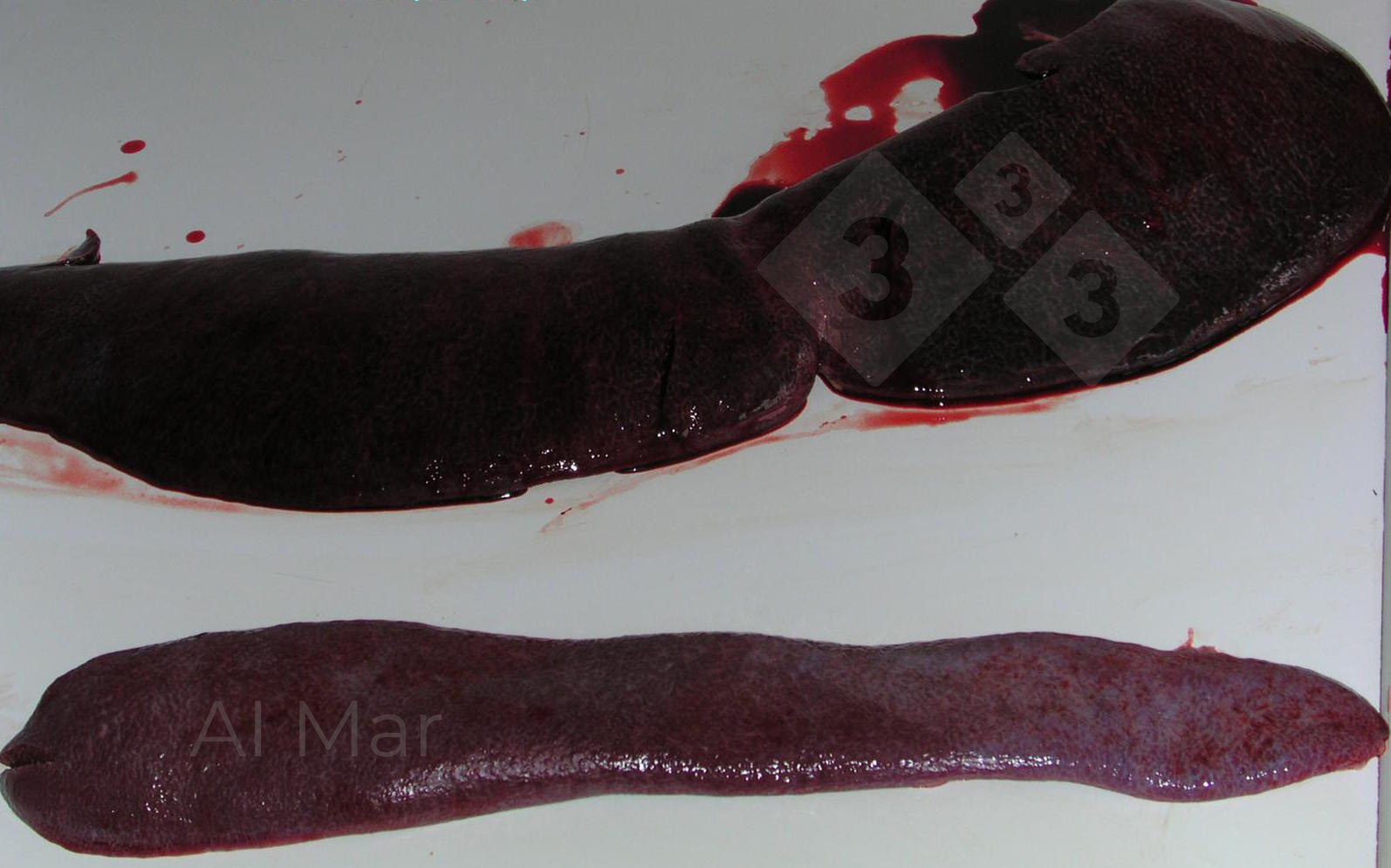 On constate une augmentation de la mortalité par mort subite chez les porcs d'engraissement. Les porcs post mortem présentent des anses intestinales distendues par des gaz, une couleur pourpre intense et sont remplis de liquide contenant beaucoup de sang.