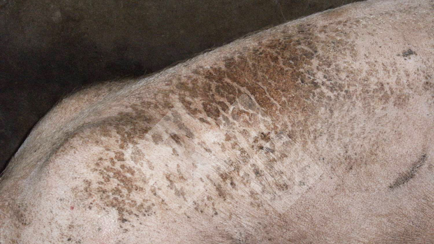 La plupart des porcs de ce parc présentent des taches foncées sur la peau. Quelle pourrait en être la cause ?