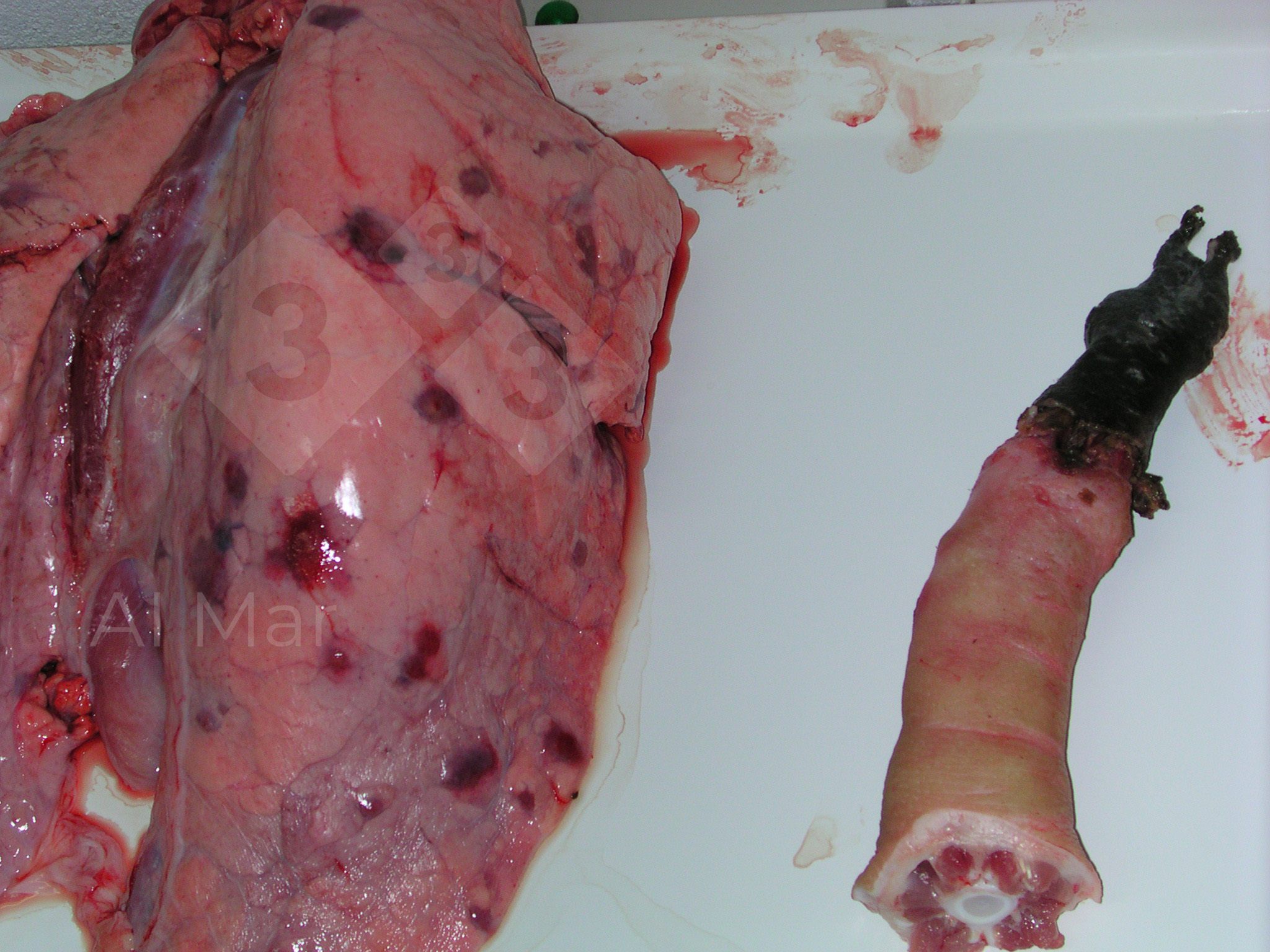Cette image en coupe transversale d'un poumon de porc est caractéristique d'une pneumonie provoquée par: