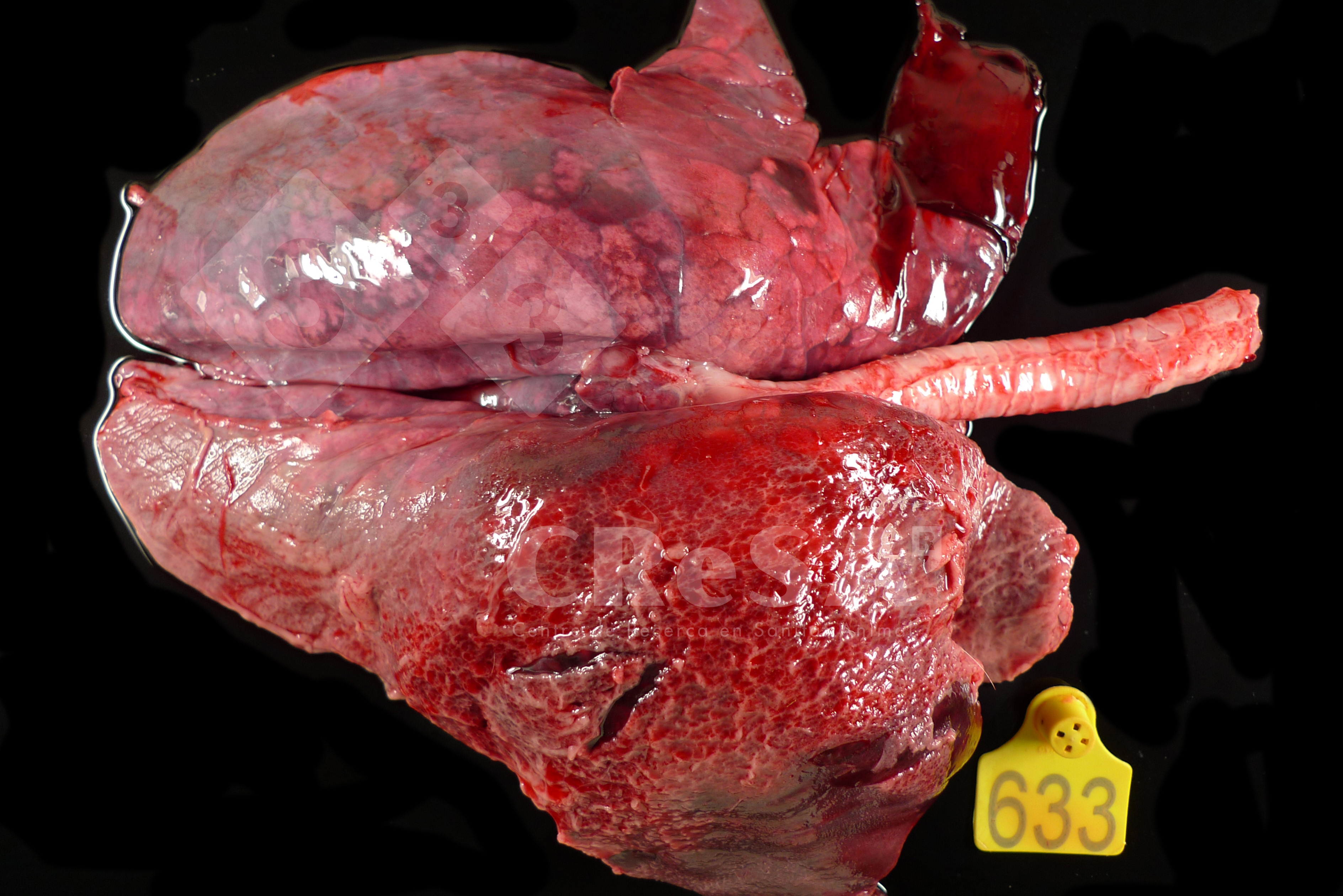 Cette image en coupe transversale d'un poumon de porc est caractéristique d'une pneumonie provoquée par: