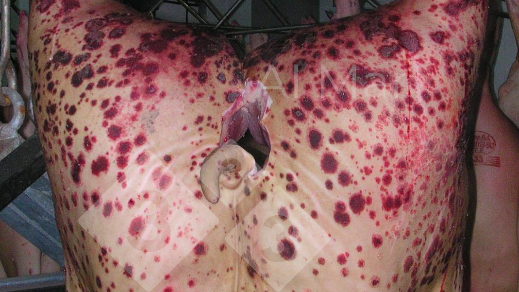 On constate une augmentation de la mortalité par mort subite chez les porcs d'engraissement. Les porcs post mortem présentent des anses intestinales distendues par des gaz, une couleur pourpre intense et sont remplis de liquide contenant beaucoup de sang.