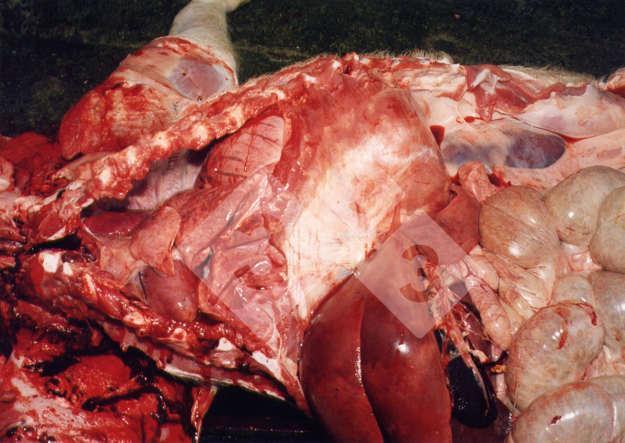 On constate une augmentation de la mortalité par mort subite chez les porcs d'engraissement. Les porcs post mortem présentent des anses intestinales distendues par des gaz, une couleur pourpre intense et sont remplis de liquide contenant beaucoup de sang.