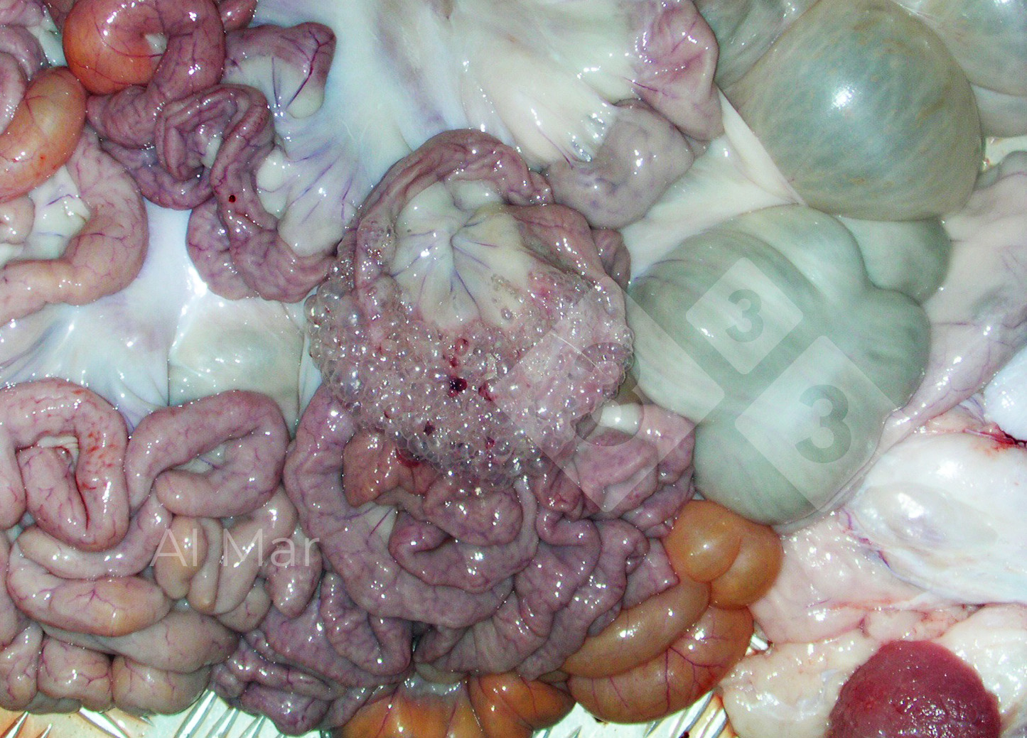 On constate une augmentation de la mortalité par mort subite chez les porcs d'engraissement. Les porcs post mortem présentent des anses intestinales distendues par des gaz, une couleur pourpre intense et sont remplis de liquide contenant beaucoup de sang.