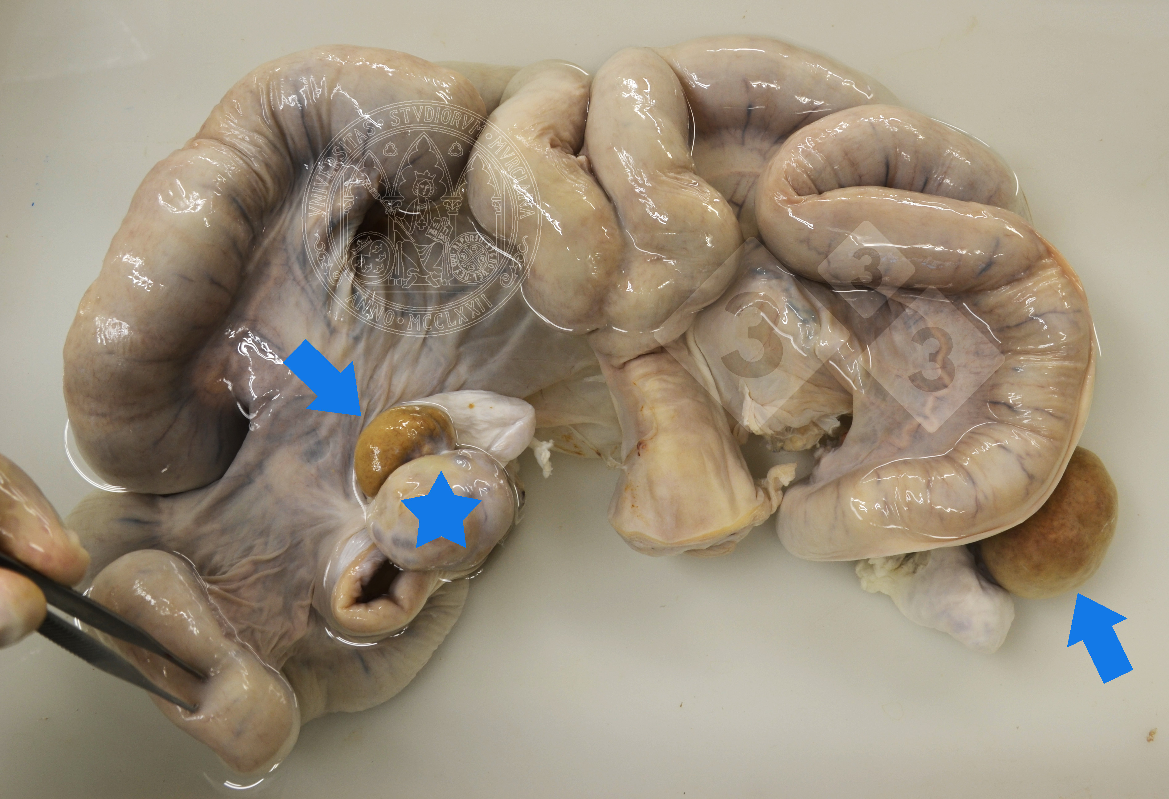 On constate une augmentation de la mortalité par mort subite chez les porcs d'engraissement. Les porcs post mortem présentent des anses intestinales distendues par des gaz, une couleur pourpre intense et sont remplis de liquide contenant beaucoup de sang.