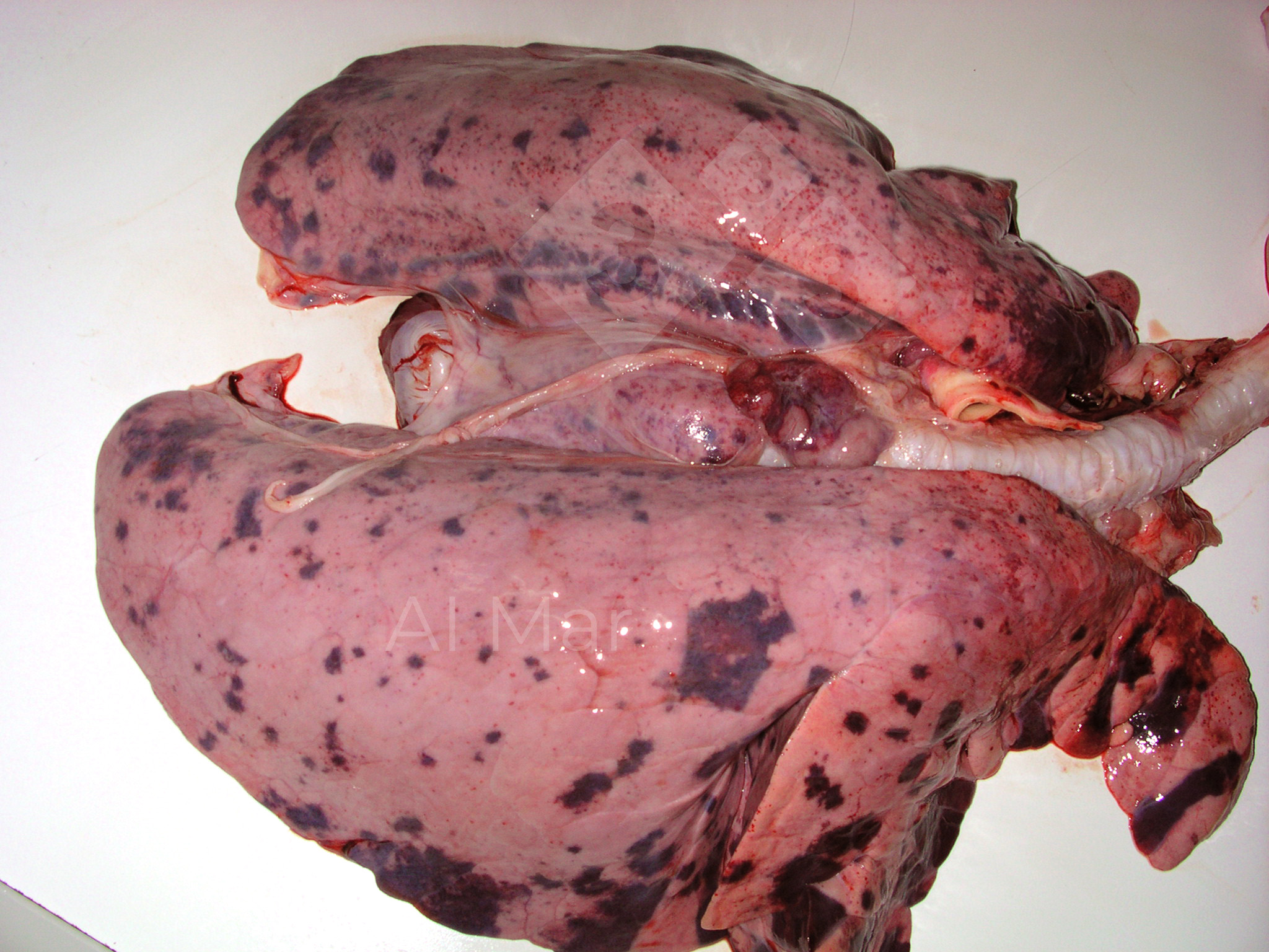 Cette image en coupe transversale d'un poumon de porc est caractéristique d'une pneumonie provoquée par: