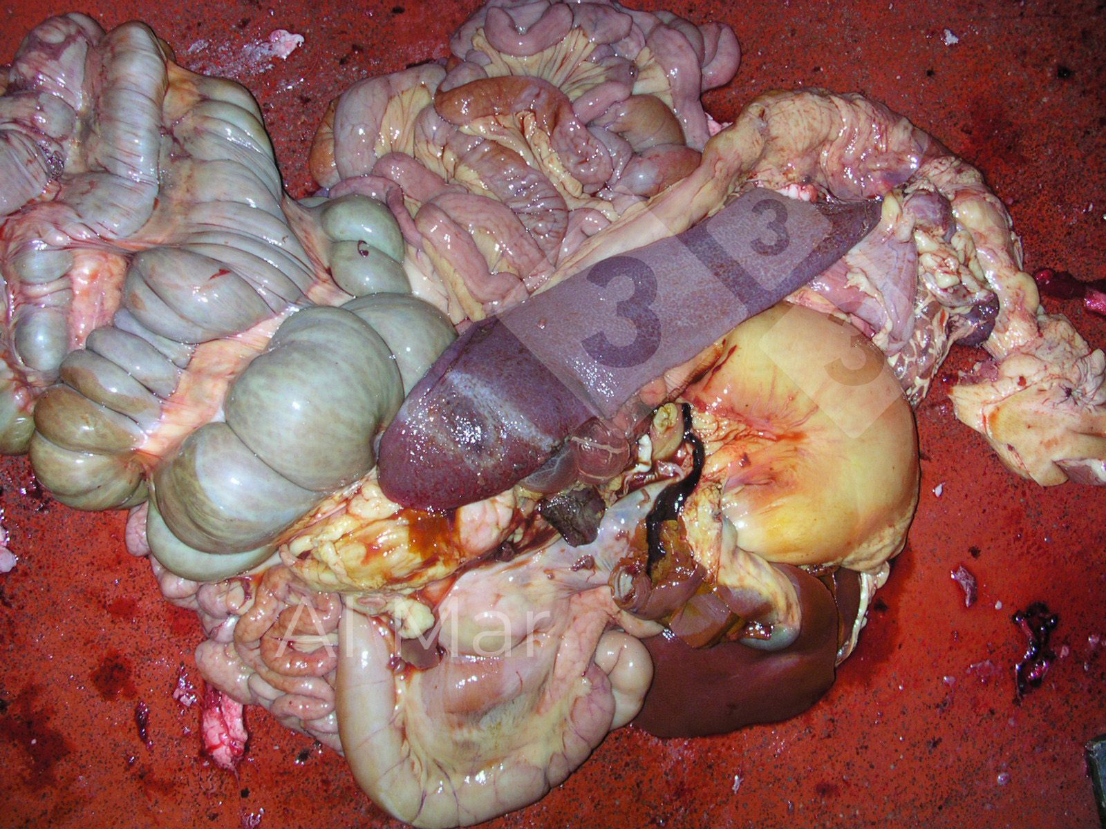 On constate une augmentation de la mortalité par mort subite chez les porcs d'engraissement. Les porcs post mortem présentent des anses intestinales distendues par des gaz, une couleur pourpre intense et sont remplis de liquide contenant beaucoup de sang.