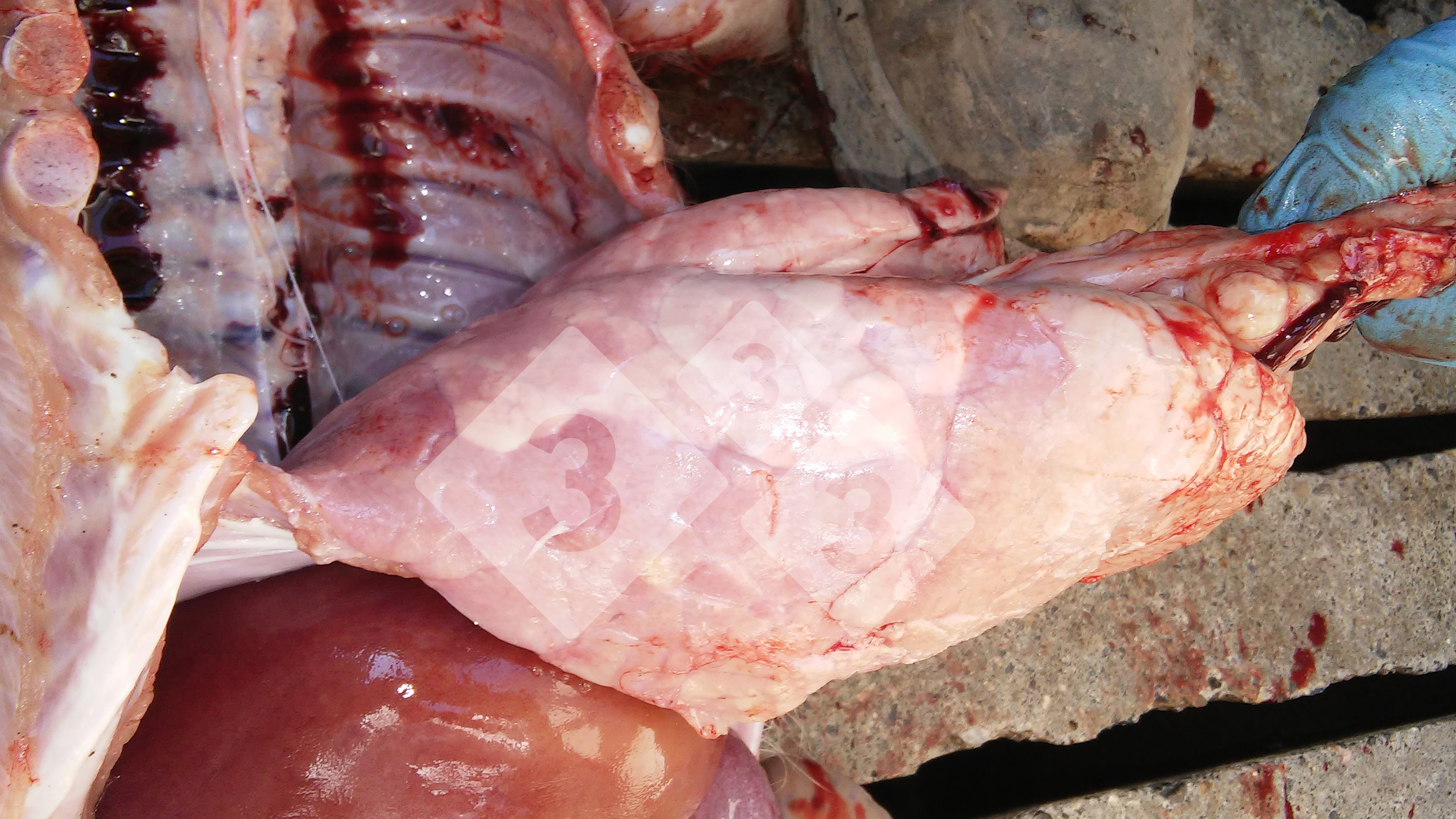 Il y a eu une augmentation de sevrés mauvais état, une respiration abdominale difficile et une mauvaise réponse au traitement antimicrobien. La mortalité oscillait entre 6% et 15%. Quelle est la cause la plus probable de cette lésion ?