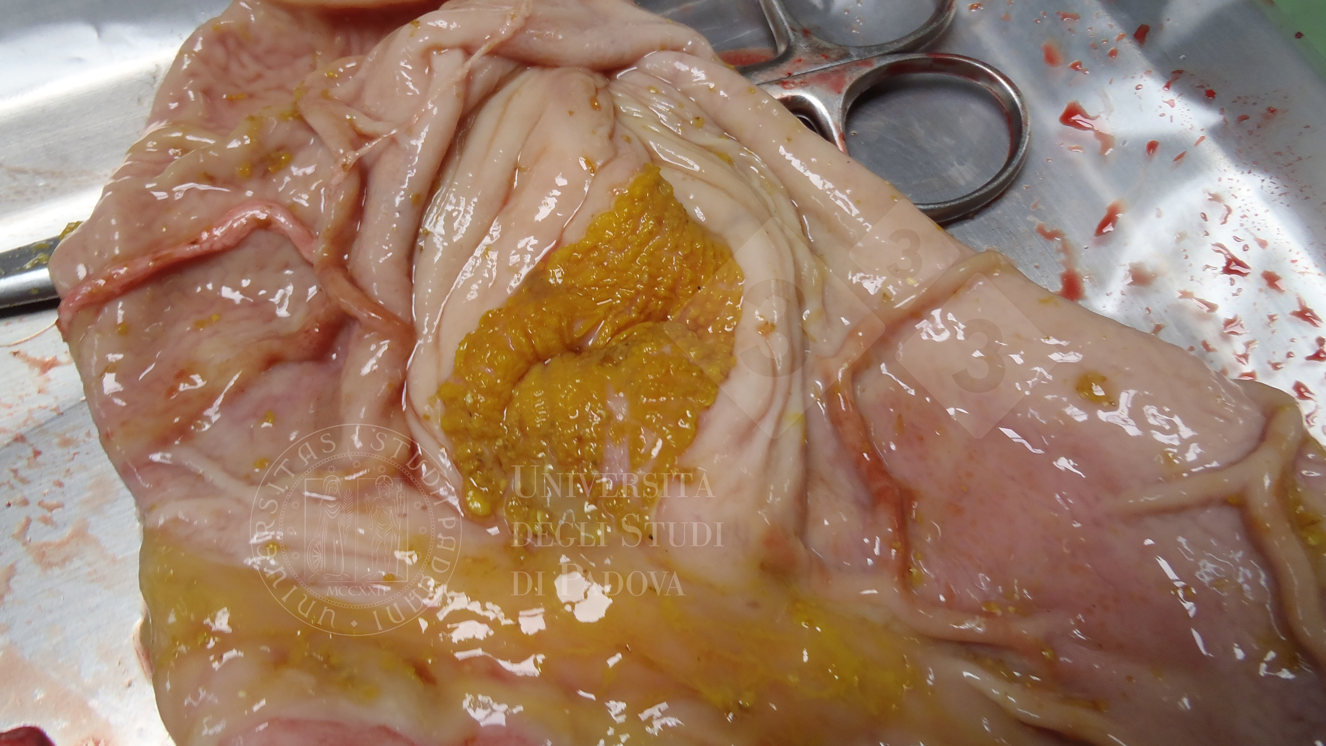 On constate une augmentation de la mortalité par mort subite chez les porcs d'engraissement. Les porcs post mortem présentent des anses intestinales distendues par des gaz, une couleur pourpre intense et sont remplis de liquide contenant beaucoup de sang.
