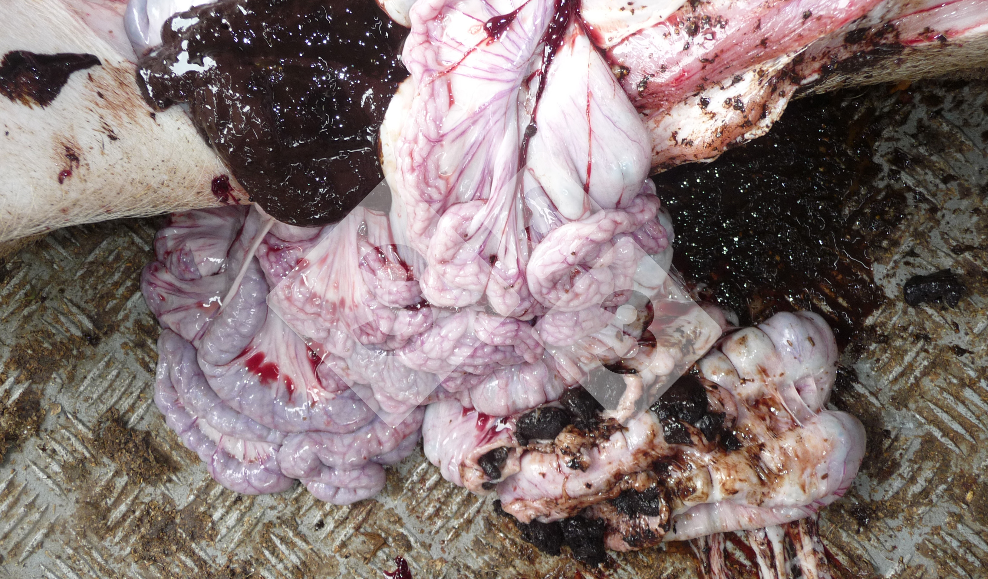 On constate une augmentation de la mortalité par mort subite chez les porcs d'engraissement. Les porcs post mortem présentent des anses intestinales distendues par des gaz, une couleur pourpre intense et sont remplis de liquide contenant beaucoup de sang.