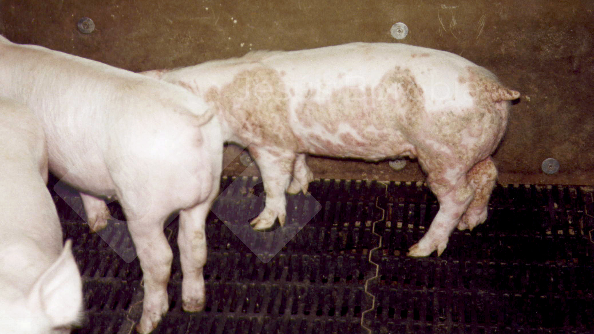 On constate une augmentation de la mortalité par mort subite chez les porcs d'engraissement. Les porcs post mortem présentent des anses intestinales distendues par des gaz, une couleur pourpre intense et sont remplis de liquide contenant beaucoup de sang.