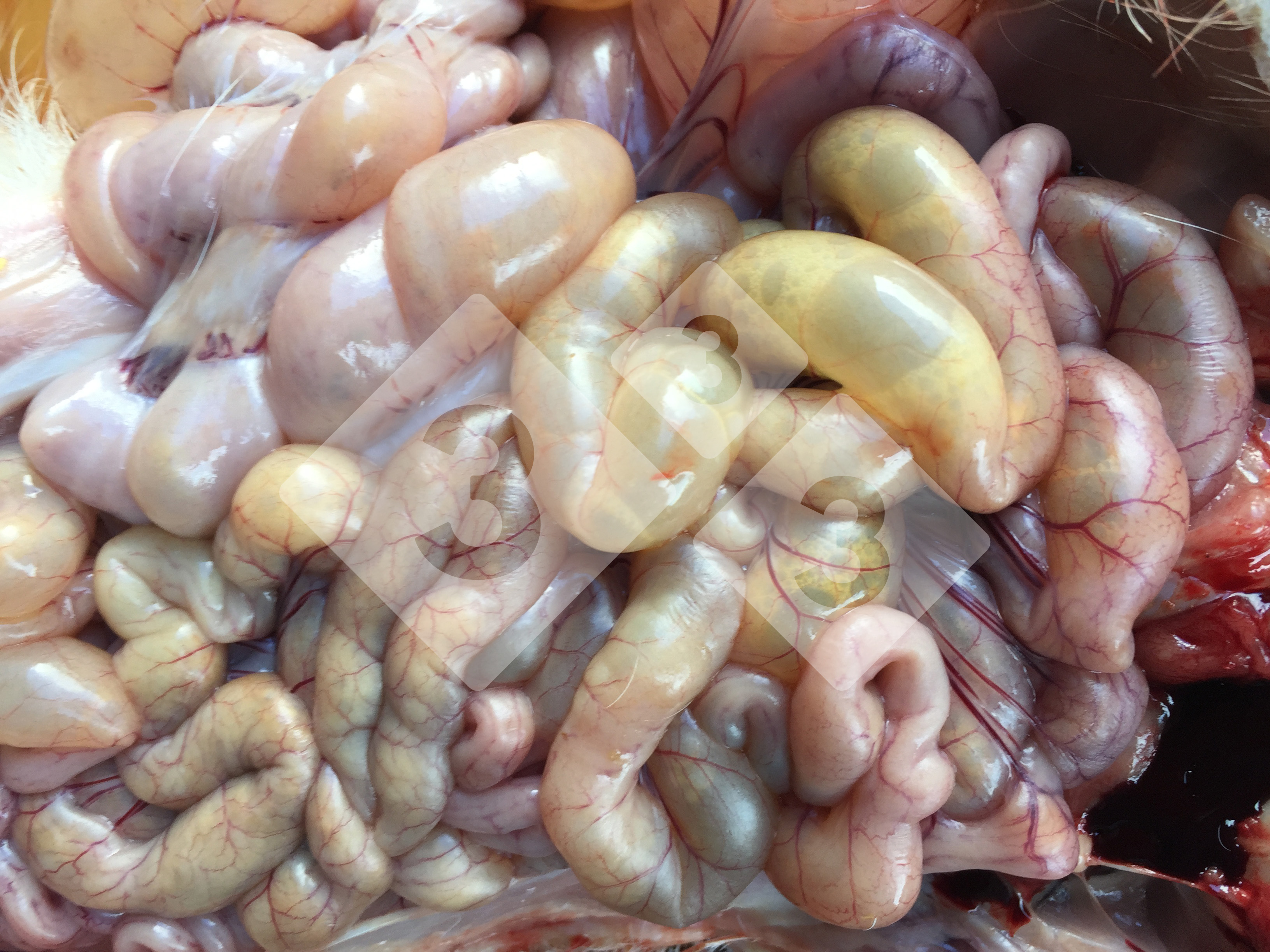On constate une augmentation de la mortalité par mort subite chez les porcs d'engraissement. Les porcs post mortem présentent des anses intestinales distendues par des gaz, une couleur pourpre intense et sont remplis de liquide contenant beaucoup de sang.