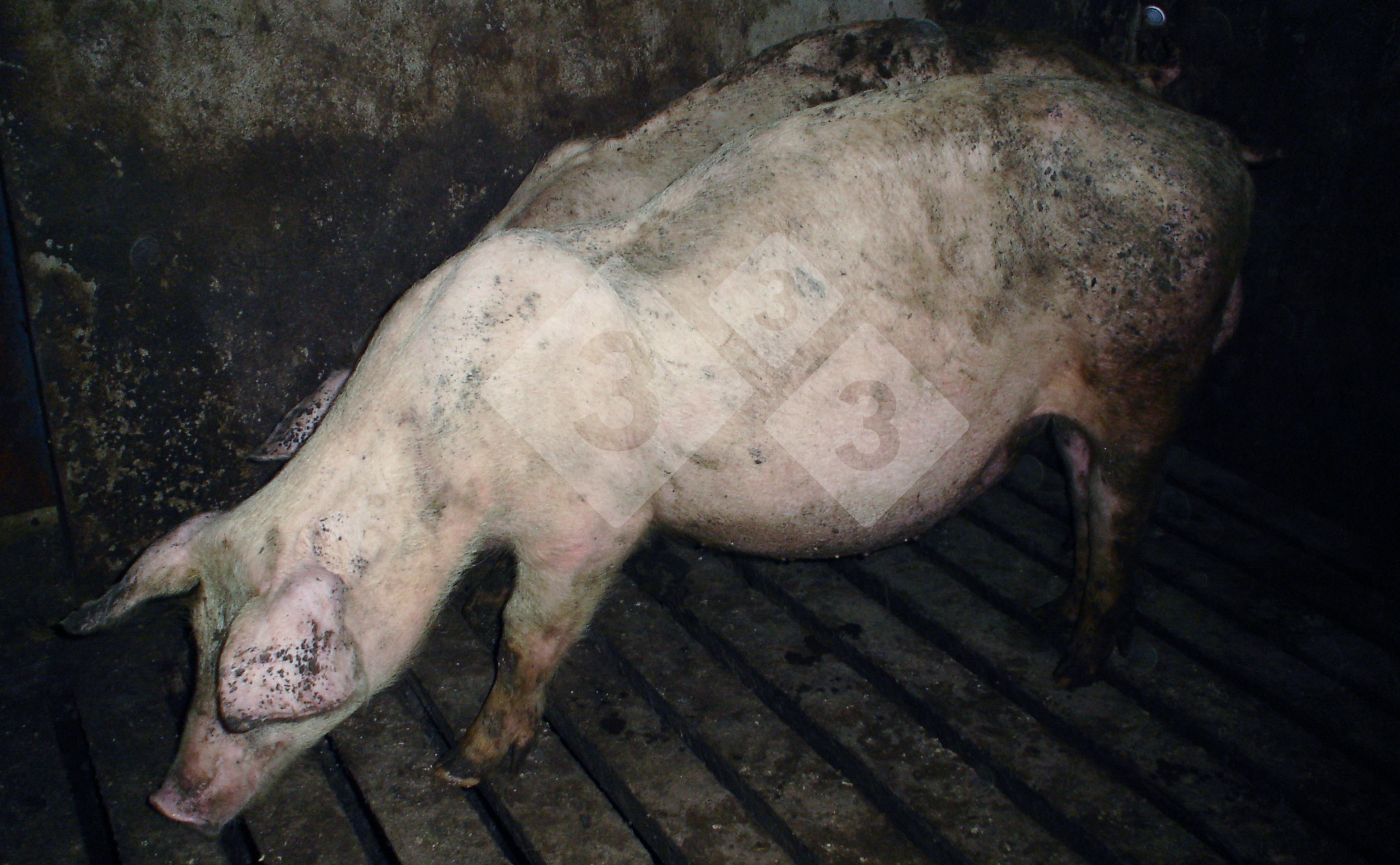 On constate une augmentation de la mortalité par mort subite chez les porcs d'engraissement. Les porcs post mortem présentent des anses intestinales distendues par des gaz, une couleur pourpre intense et sont remplis de liquide contenant beaucoup de sang.