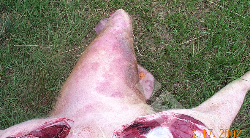 On constate une augmentation de la mortalité par mort subite chez les porcs d'engraissement. Les porcs post mortem présentent des anses intestinales distendues par des gaz, une couleur pourpre intense et sont remplis de liquide contenant beaucoup de sang.