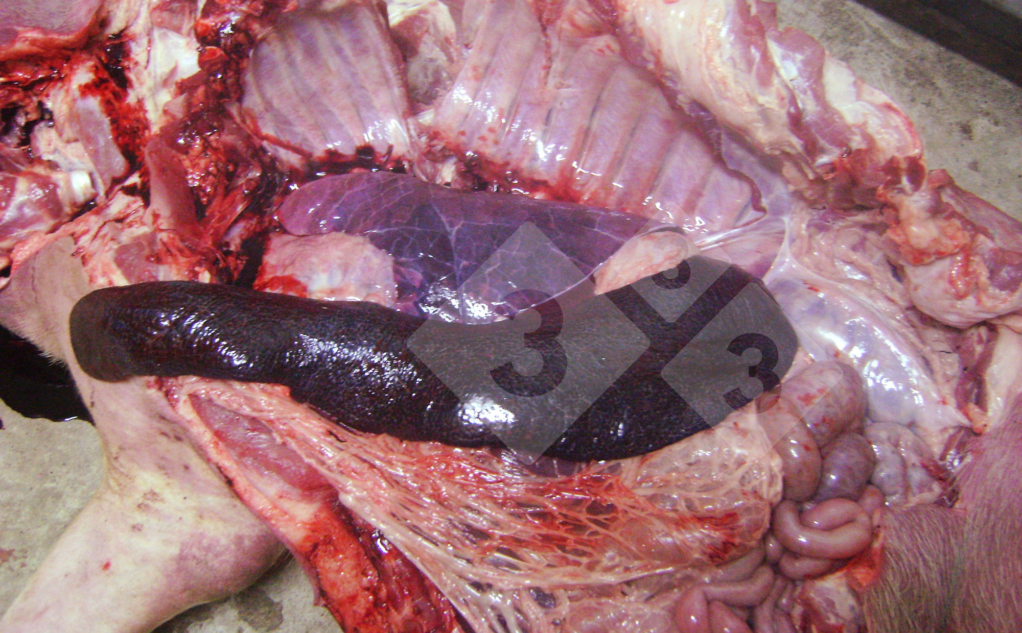On constate une augmentation de la mortalité par mort subite chez les porcs d'engraissement. Les porcs post mortem présentent des anses intestinales distendues par des gaz, une couleur pourpre intense et sont remplis de liquide contenant beaucoup de sang.