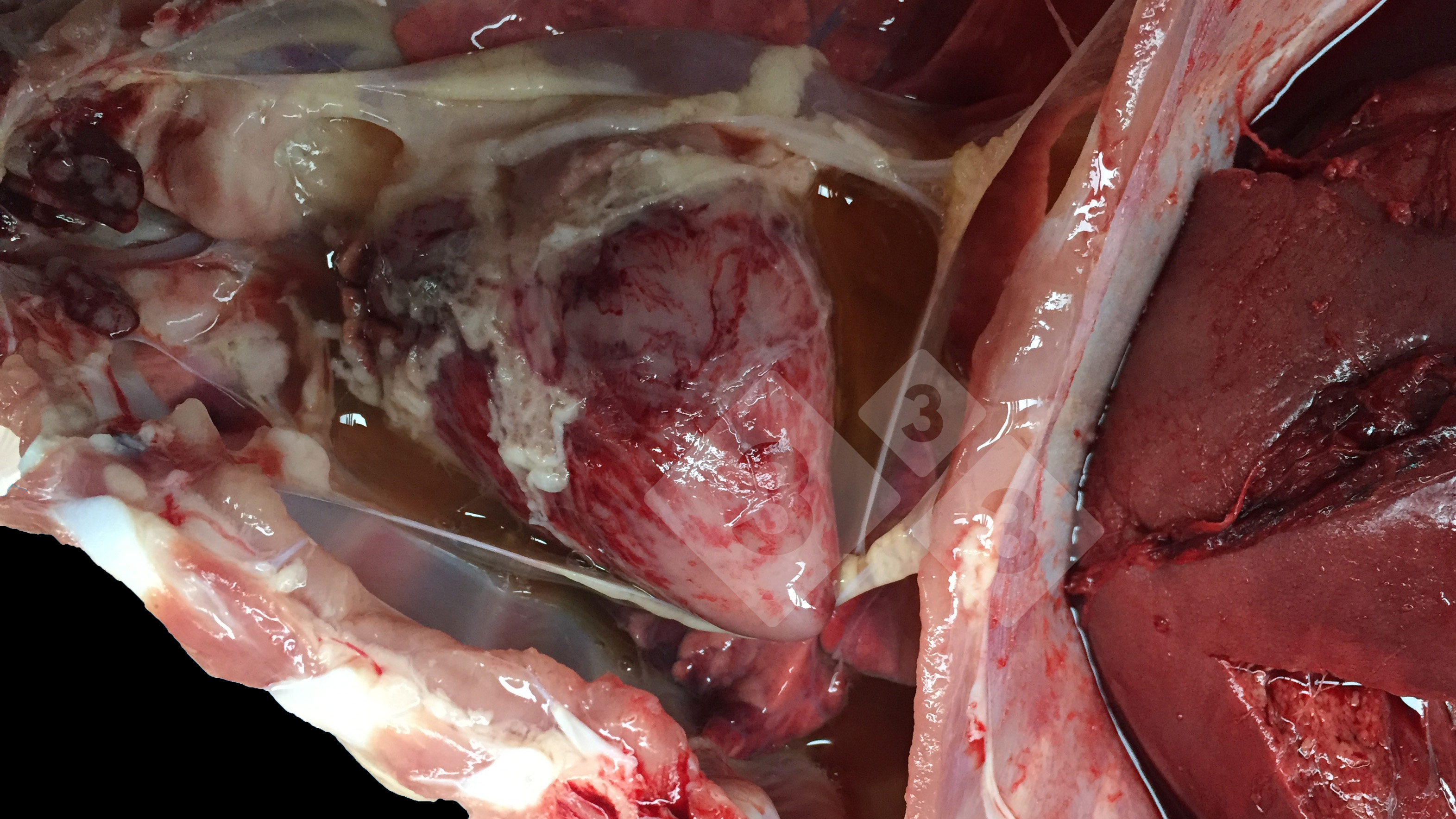 Une épidémie de mort subite touche des porcs de 6 semaines. À l'autopsie, le sac péricardique est distendu et contient un liquide de couleur paille contenant des filaments de fibrine. Le cœur présente des zones de nécrose. Quelle est la cause probable ?