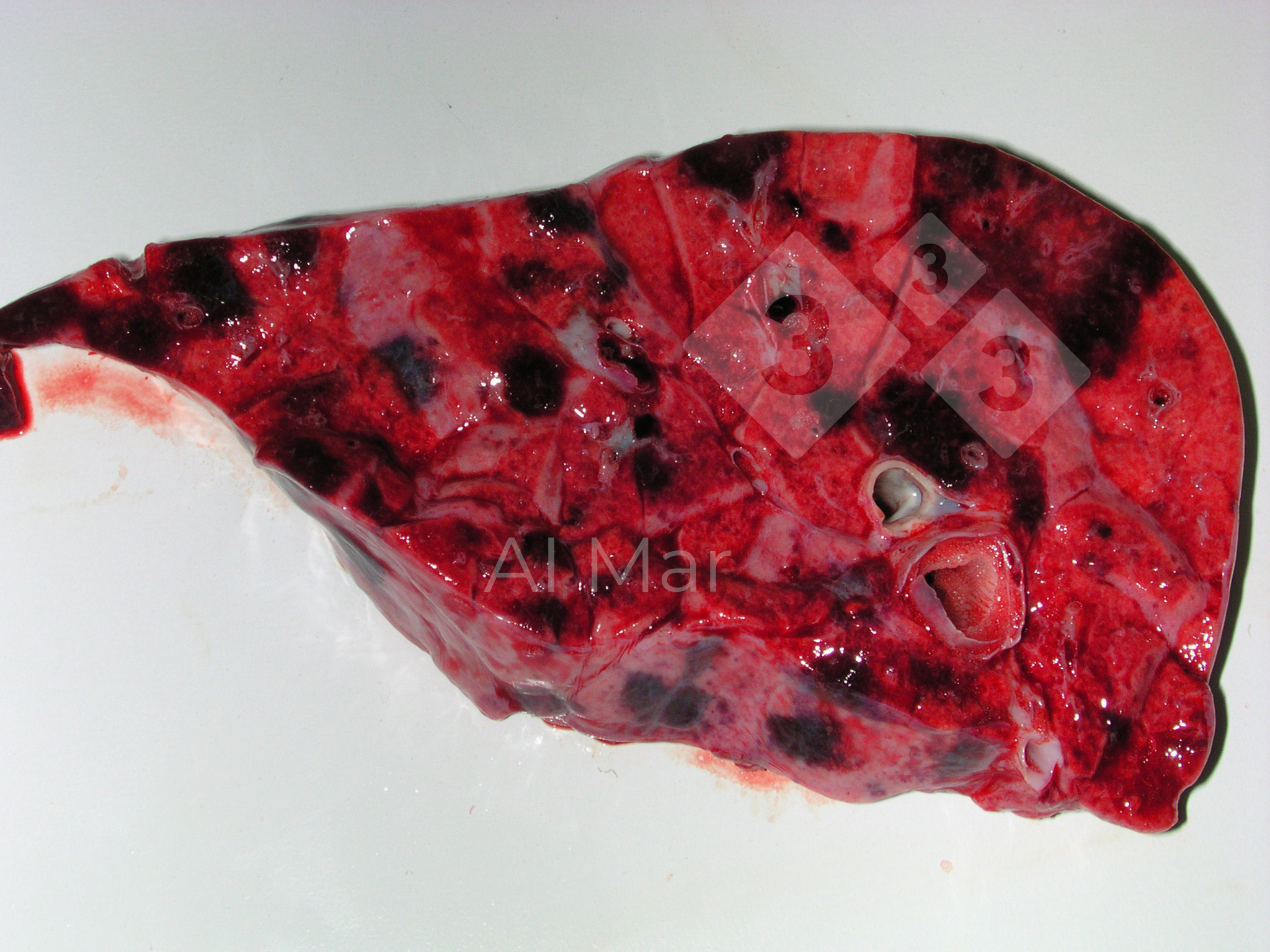 Cette image en coupe transversale d'un poumon de porc est caractéristique d'une pneumonie provoquée par: