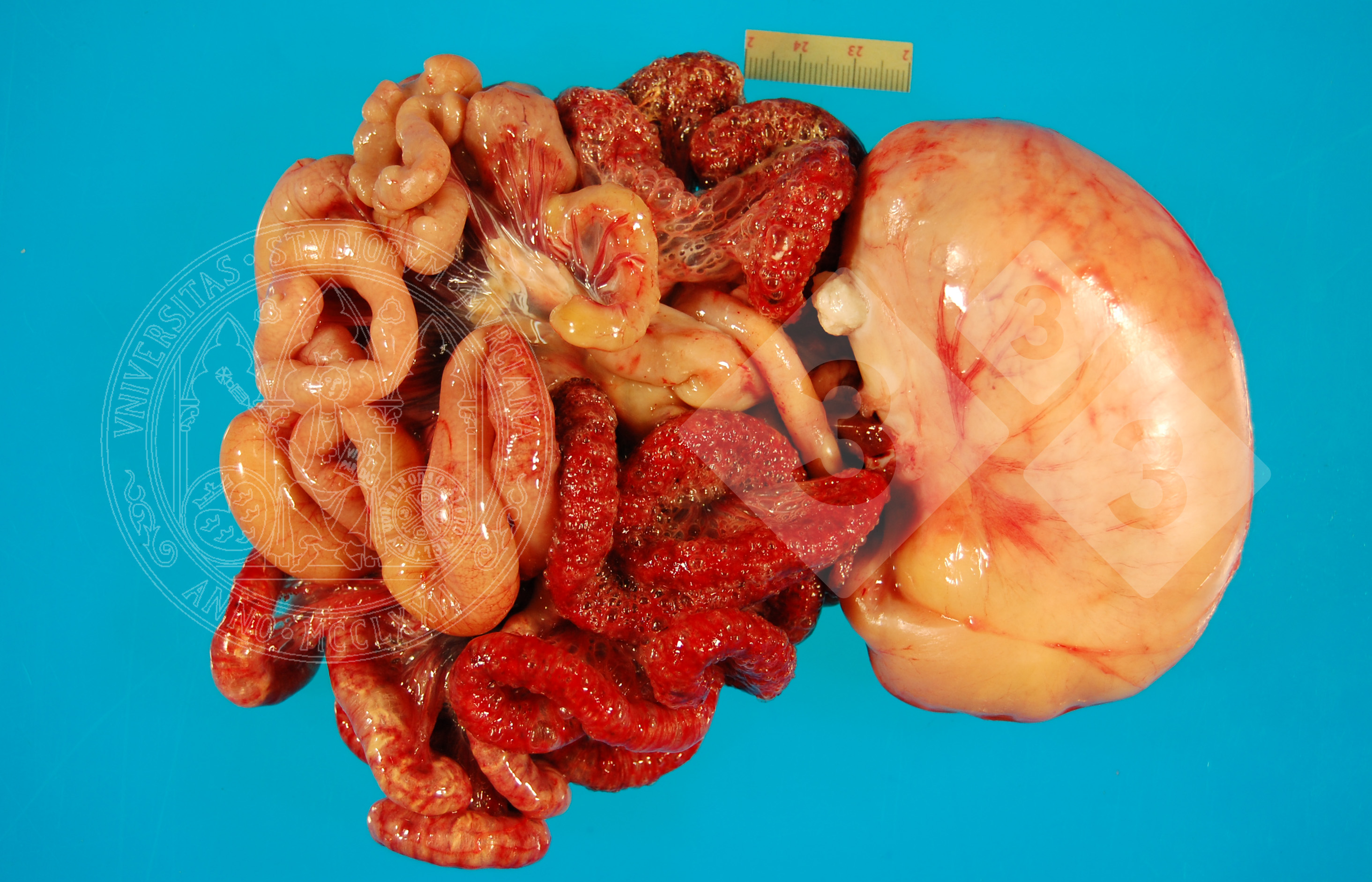 On constate une augmentation de la mortalité par mort subite chez les porcs d'engraissement. Les porcs post mortem présentent des anses intestinales distendues par des gaz, une couleur pourpre intense et sont remplis de liquide contenant beaucoup de sang.