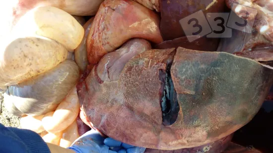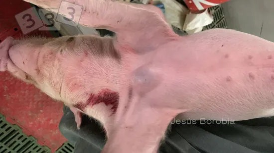 Il y a un épisode de mortalités subites, de manque d'appétit, de forte fièvre et de détresse respiratoire chez les porcs entre 12 semaines et l'abattage. Quelle est la cause la plus probable de cette lésion ?
