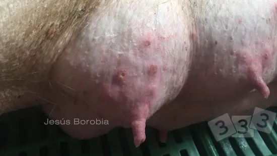 On nous consulte pour un problème de dysgalaxie dans un élevage, et nous observons ces ulcères près des mamelons. Connaissez-vous la cause ?