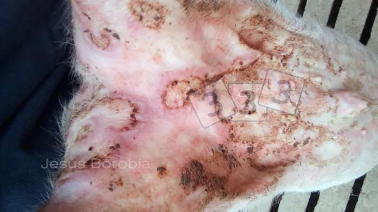 Dans l'infirmerie d'un engraissement on trouve ce porc. Quelle est la cause la plus probable de l'aspect de cette oreille ?