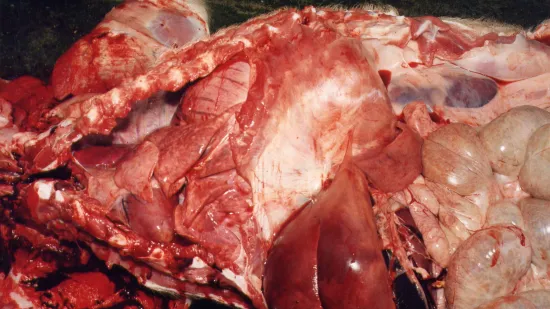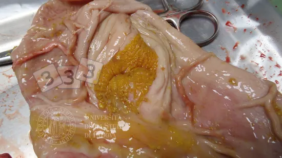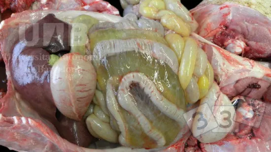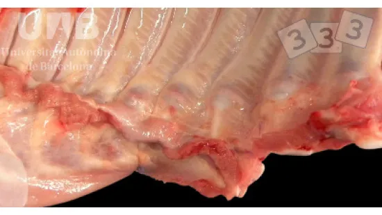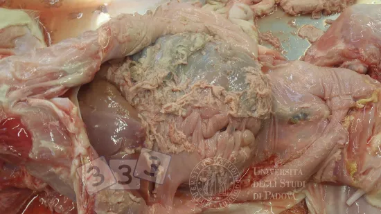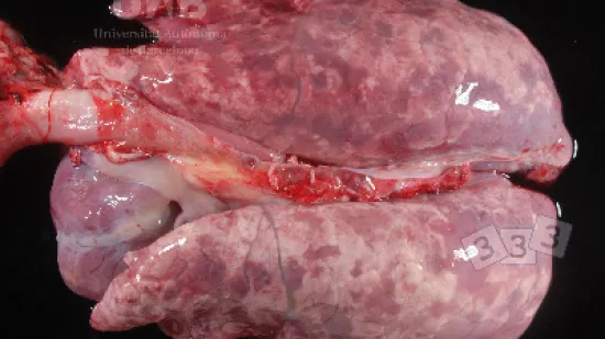 Il y a eu une augmentation de sevrés mauvais état, une respiration abdominale difficile et une mauvaise réponse au traitement antimicrobien. La mortalité oscillait entre 6% et 15%. Quelle est la cause la plus probable de cette lésion ?