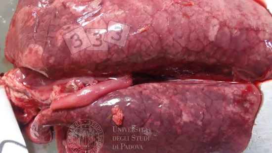 Il y a une épidémie de morts subites, perte d'appétit, forte fièvre et respiration laborieuse chez des porcs de 15 semaines jusqu'à l'abattage. L'inspection à l'abattoir montre des poumons comme ceux de la photo. Quelle est la cause la plus probable?