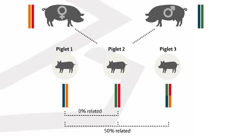 La truie et le verrat ont leurs propres gènes, et chacun transmet exactement la moitié de ses gènes à sa progéniture. Mais la moitié qui est transmise est aléatoire. Dans cet exemple, le porcelet 1 a hérité d'une partie bleue de l'ADN du verrat et d'une partie orange de l'ADN de la truie, tandis que le porcelet 2 a hérité d'une partie verte de l'ADN du verrat et d'une partie rouge de l'ADN de la truie. Les porcelets 1 et 2 ont tous deux hérité de la moitié des gènes du verrat et de la truie, mais les gènes hérités sont complètement différents. Par conséquent, les porcelets 1 et 2 sont liés à 0 % l'un à l'autre. Le porcelet 3 a hérité de la moitié de chaque partie colorée de l'ADN de la truie et du verrat, et est donc apparenté à 50 % au porcelet 1 et au porcelet 2.