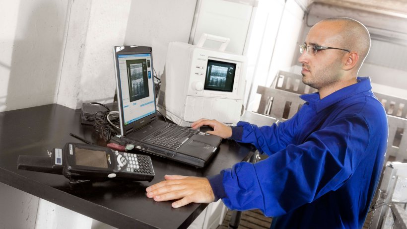 La suspension du transducteur est équilibrée avec un contrepoids pour que le dispositif ne pèse pratiquement rien. Cela permet également au transducteur d’être déplacé dans le sens de la longueur afin que la sonde puisse être positionnée avec précision sur la zone à scanner.