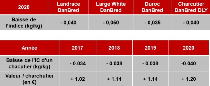 DanBred démontre et documente tous les ans l’amélioration du progrès génétique aussi bien pour ses reproducteurs de races pures que pour les charcutiers DanBred (DLY). Au cours des 10 dernières années, le progrès génétique créé a généré une baisse potentielle de l’indice de consommation d’un charcutier DanBred de 0,32 kg/kg. Cette baisse s’accélère année après année pour atteindre -0,040 kg/kg pour la seule année 2020, soit un gain de 1 € 20 par charcutier. Un gain économique qui se cumule année après année.