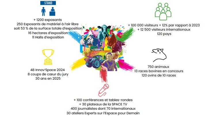 Depuis 1987, le SPACE est un Salon majeur et incontournable pour tout le secteur agricole en attirant chaque année plus de 1 200 exposants et plus de 100 000 visiteurs du monde entier avec 120 pays représentés. Cette attractivité du SPACE renforce toujours davantage son positionnement comme étant le rendez-vous mondial de tous les élevages !