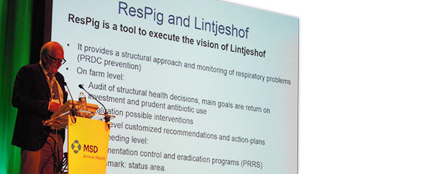 Rika Jolie, directrice technique générale de MSD Animal Health, a présenté le système ResPig®, une plateforme basée sur le site web et dont l’objectif est de proposer des stratégies de contrôle et de prévention du complexe respiratoire porcin, spécifiques à chaque exploitation. Sur le site www.respig.fr est disponible toute l’information détaillée sur ce système. Immédiatement ensuite, Frans Dirven, consultant porcin et directeur de la clinique vétérinaire hollandaise Lintjeshof, a partagé son expérience pratique sur l’application de ResPig® ainsi que sur les progrès réalisés par le biais de cette approche pour le contrôle du SDRP et d’autres maladies respiratoires, la réduction de l’usage d’antibiotiques, etc. dans les plus de 70 fermes appliquant dors et déjà ce système.