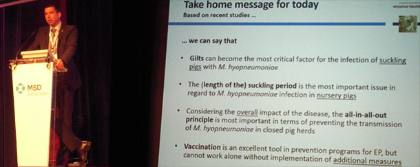 La présentation suivante a été offerte par Heiko Nathues, directeur de médecine porcine à l’Université de Berne, qui a concentré son exposé sur Mycoplasma hyopneumoniae, expliquant le modèle de transmission développé par son équipe, ainsi que l’importance économique et de prévention de cette maladie.