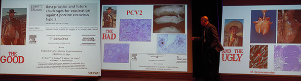 Quim Segalés, directeur du CReSA, a présenté de manière agréable et informative son exposé sur le “Contrôle des infections par PCV2 et M hyo : le bon, la brute et le truand”, où il a identifié chaque pathogène et la vaccination contre ces derniers à chacun des protagonistes du célèbre film. Au cours de la présentation, il a expliqué l’efficacité des vaccins contre ces deux pathogènes, leur capacité à vaincre l’interférence avec les anticorps maternels et la protection croisée entre génotypes de PCV2.