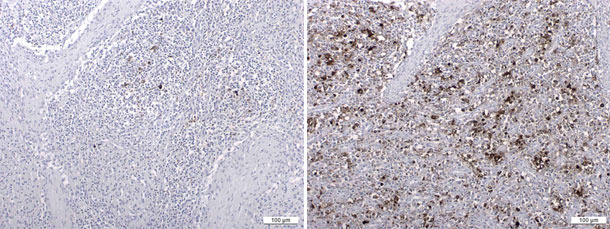 | Antígenos de PCV2 detectados por inmunohistoquímica. En los ganglios linfáticos de los cerdos infectados subclínicamente puede encontrarse muy poca cantidad de células infectadas. | Antígenos de PCV2 detectados por inmunohistoquímica. En los ganglios linfáticos de los cerdos infectados clínicamente puede encontrarse una cantidad muy importante de células infectadas. |