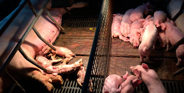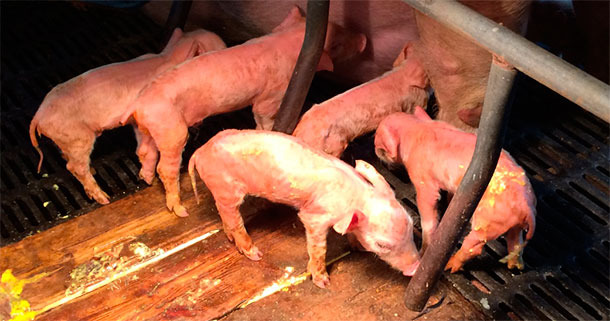 Figure 2 : Diarrhée sévère et déshydratation des porcelets atteints par la DEP (gauche) par rapport à la portée normale voisine.