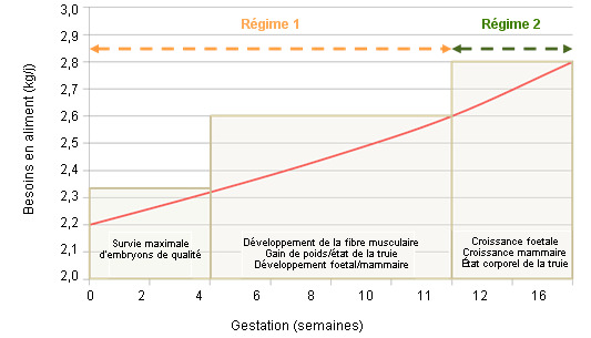 Les besoins nutritionnels des truies changent pendant la gestation et l’apport alimentaire doit satisfaire à cette demande, d’où le besoin d’une alimentation par phases. En termes d’énergie, une stratégie basée sur un seul régime peut suffire (12,5 MJ EM/kg), en augmentant les niveaux le 85e jour de gestation. Les besoins en acides aminés augmentent aussi, mais il peut y avoir également un changement dans l’équilibre en acides aminés entre le début/milieu et la fin de la gestation, ainsi qu’en fonction de la parité, ce qui peut rendre nécessaire un régime alimentaire avec une composition en acides aminés différente.