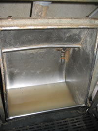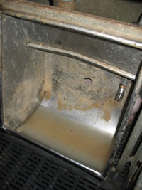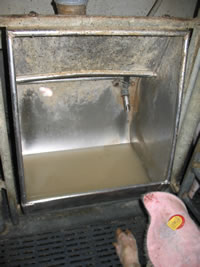 La truie a tout mangé mais elle n'a pas bien nettoyé l'auge: elle ne désire probablement pas plus d'aliment. |