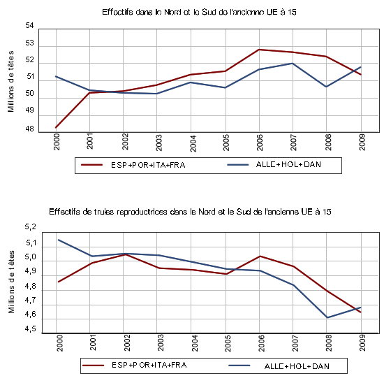 A partir de 2009, les vitesses différentes de chaque pays pour surmonter la crise des coûts de prodiuction ont conduit à des évolutions divergentes concernant les effectifs porcins; il y a eu des baisses plus fortes et prolongées dans les pays où les pertes étaient les plus fortes (l'Est de l'Europe surtout) et plus faibles là où l'éleveur avait plus de capacité de résistance (essentiellement en Allemagne, le premiers pays producteur).