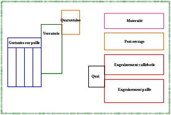 | Gestantes sur paille | 4 cases de 16 (2 cases par bande) |
