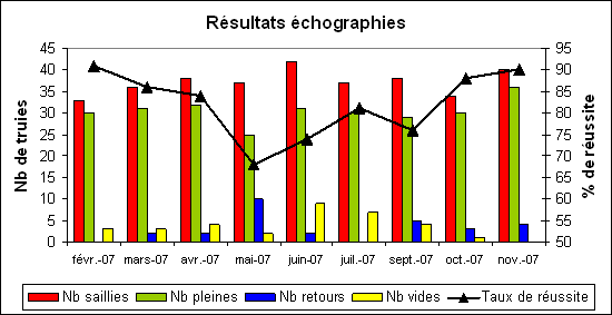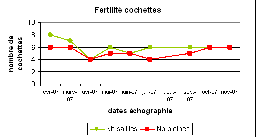 - Fertilité : résultats des échographies pour les cochettes sur l’année 2007 avec le nombre de cochettes saillies et le nombre de cochettes pleines par bande. Bonne fertilité des cochettes en moyenne de 89%.