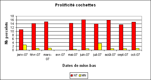 - Prolificité des cochettes : résultats de naissage des cochettes par bande en nés totaux et mort-nés par bande au cours de l’année 2007. Prolificité élevée sur cochettes avec peu de mort-nés.