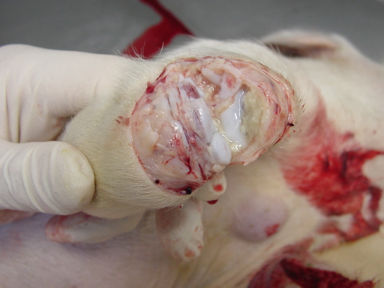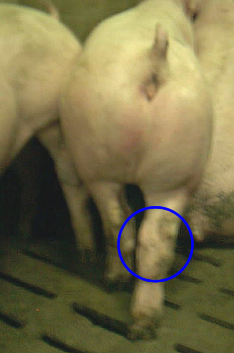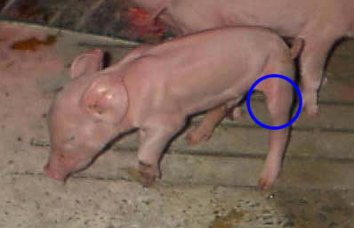 | On observe des arthrites sur environ 5% des porcelets. Certains ont plusieurs articulations touchées. Leur état général est moyen mais ils ne présentent pas d'autre signe clinique. |