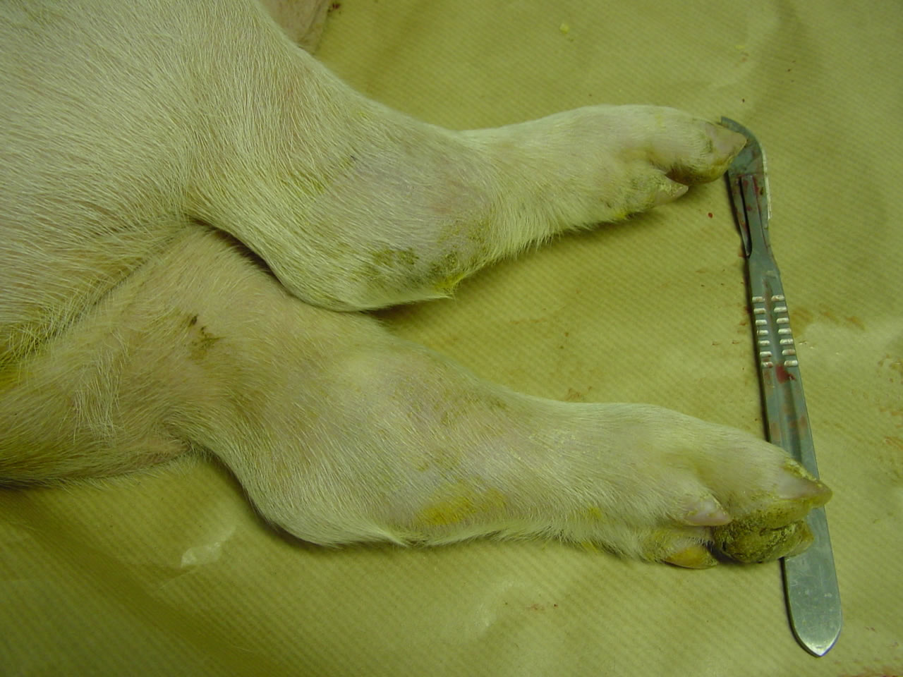 On constate le même type de symptômes (polyarthrites) sur 4 à 5% des animaux essentiellement en début de PS (8 à 15 kg).