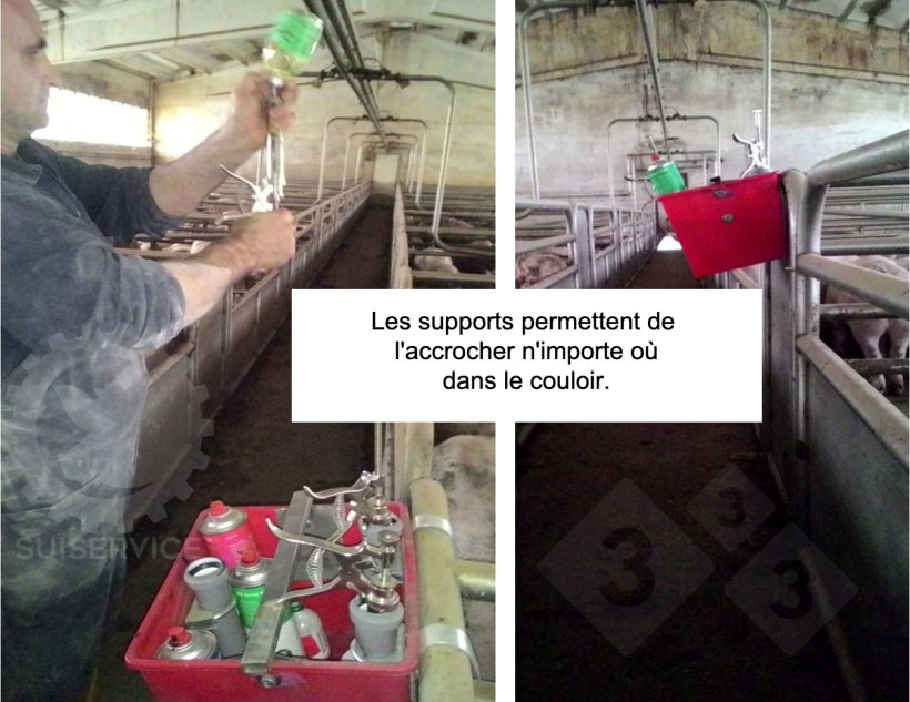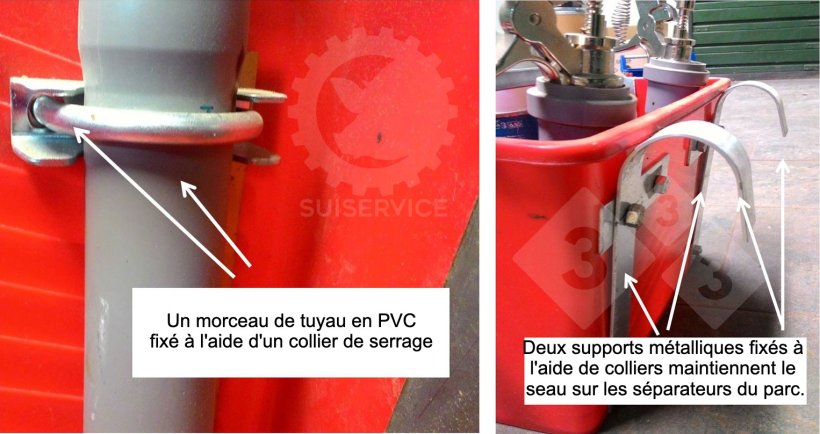 On voit parfois dans les élevages des récipients improvisés et inadaptés, mais celui que nous présentons ici est très simple et fonctionnel, fabriqué avec des matériaux que l'on trouve couramment sur place : un seau rectangulaire en plastique, des tubes en plastique, des colliers de serrage et des supports métalliques.